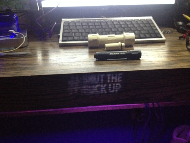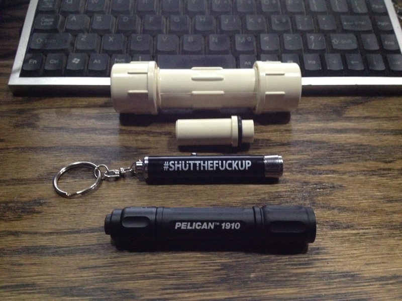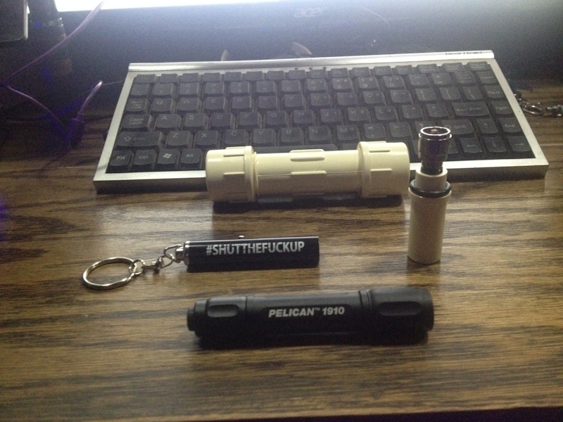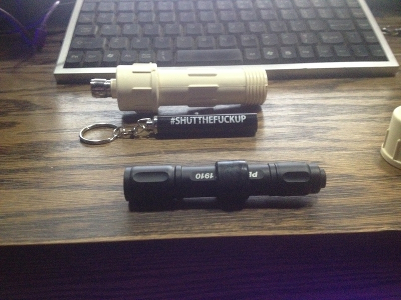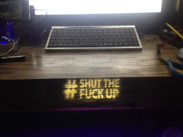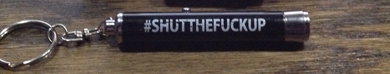 It's a little LED keychain with a lens that projects "#SHUT THE FUCK